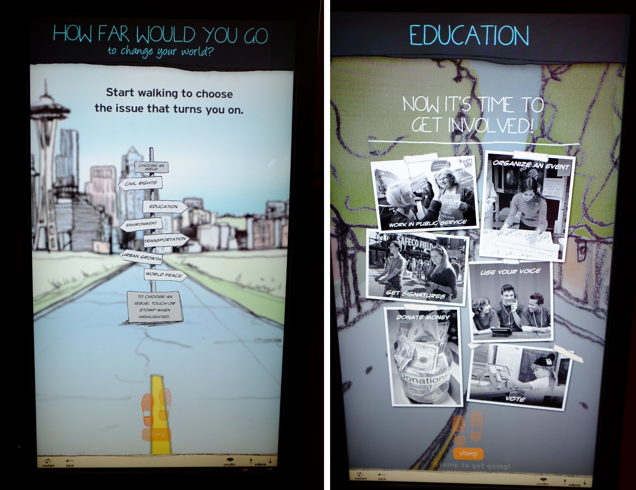 커다란 LED 스크린 앞에 서서 직접 뚜벅뚜벅 걸어야 영상이 진행된다. 아까 철도 건설을 직접 망치질을 시켰던 것과 비슷하다. 이게 무슨 심리적 효과를 노린 것인지는 몰라도, 확 몰입이 된 것은 사실이다.시애틀은 또 MS의 도시다. 시애틀의 신도시 벨뷰 지역에 현재 MS 본사 캠퍼스가 있다.