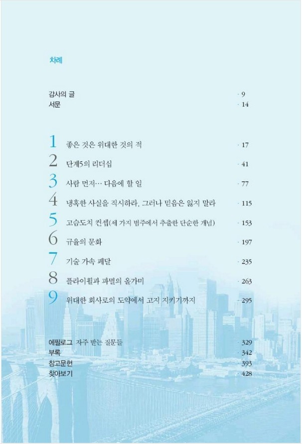 15년 전에, 다니던 회사에서 동료들과 치열하게 스터디 했던 책 중에 "좋은 기업을 넘어 위대한 기업으로(Good to Great)"가 있었다. 포츈500에 속한 기업 중에 엄격한 기준에 따라 11개 기업을 골라서 그들의 특징을 분석하고 공통 원리를 찾아내는 방식으로 위대한 기업이란 어떤 것인가를 제시하는 책이었다. 방식도 내용도 정말 대박이었던 책이다. 책에서 배운 원리들을 비록 회사에는 제대로 적용하진 못했지만, 이후 우리 부부의 삶에 적용하고 체화시켜서 결국에는 큰 유익을 얻을 수 있었다. 책에 나오는 "고슴도치 컨셉"은 흑곰북스 설립이라는 결실로 이어졌고, "규율"과 "플라이휠"은 흑곰북스 마케팅의 원칙이 됐으며, "냉혹한 사실 직시하기"와 "단계5의 리더십"은 황작가의 강사 생활의 원리 및 은퇴 결정의 근거가 되었고, 현재 운영하는 스터디에까지 적용되고 있다.
