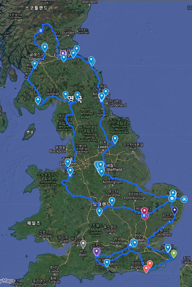 런던에서 출발해서 나 혼자 남쪽을 작게 돌고, 노리치에서 아내를 만난 뒤, 함께 시계 반대방향으로 올라갔다가 내려오는 코스. 지도상의 코스는 처음에 계획한 것이고, 실제 경로는 (특히 후반부가) 약간 달라졌다.