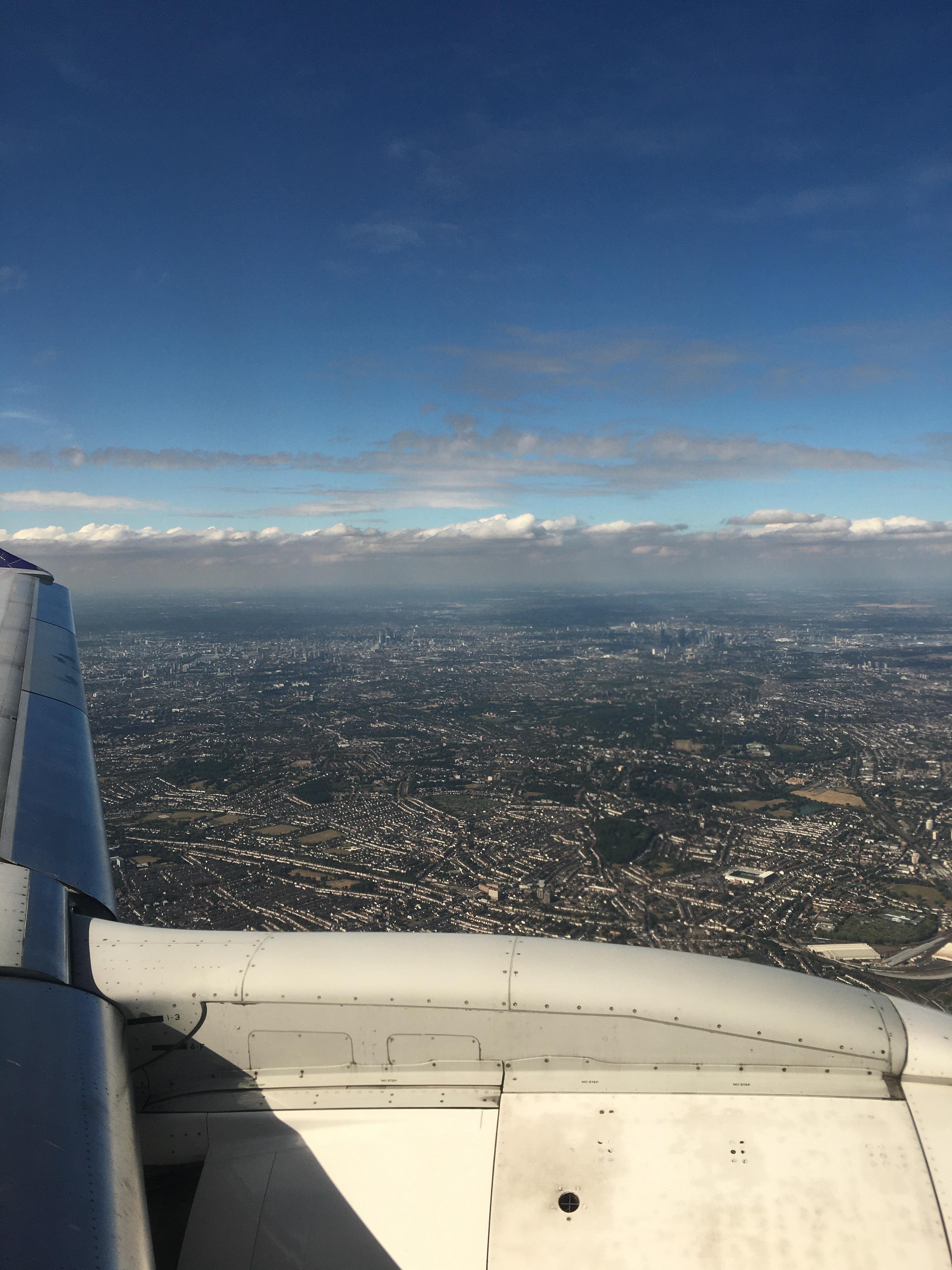 잠시 후, 이번엔 한 줄에 둘씩 둘씩 네 명이 앉는 더 작은 뱅기를 타고 런던으로 향했다. 2시간 남짓 비행한다고 기장이 알려주는데 귀에 쏙쏙 들린다. 7달동안 집에서 넷플릭스만 쳐 봤더니 듣기능력이 좀 늘었다.