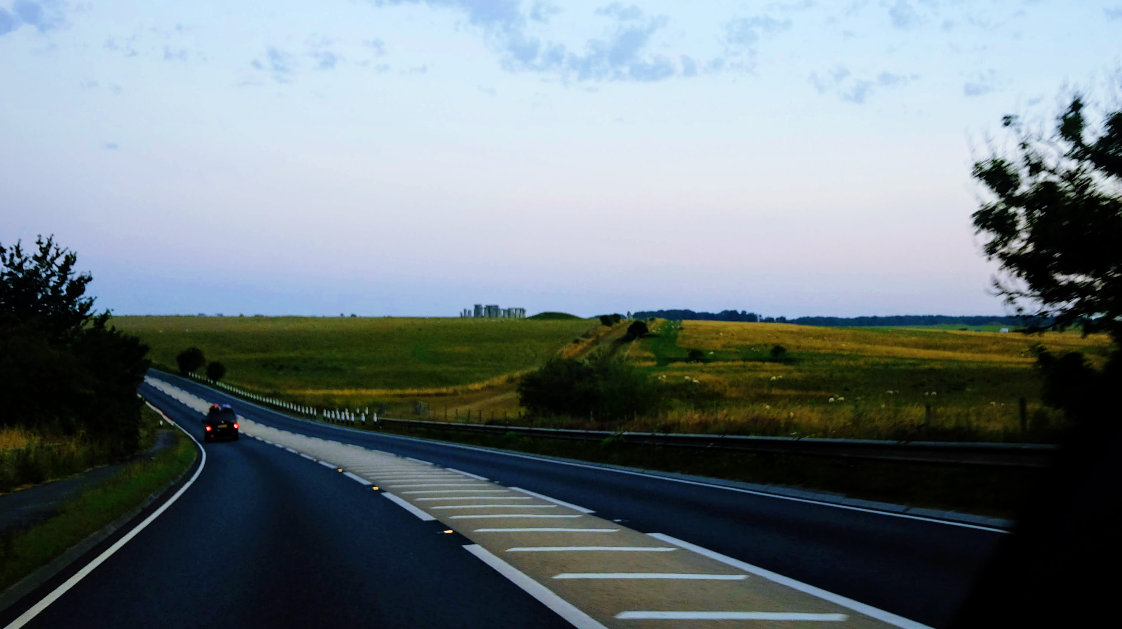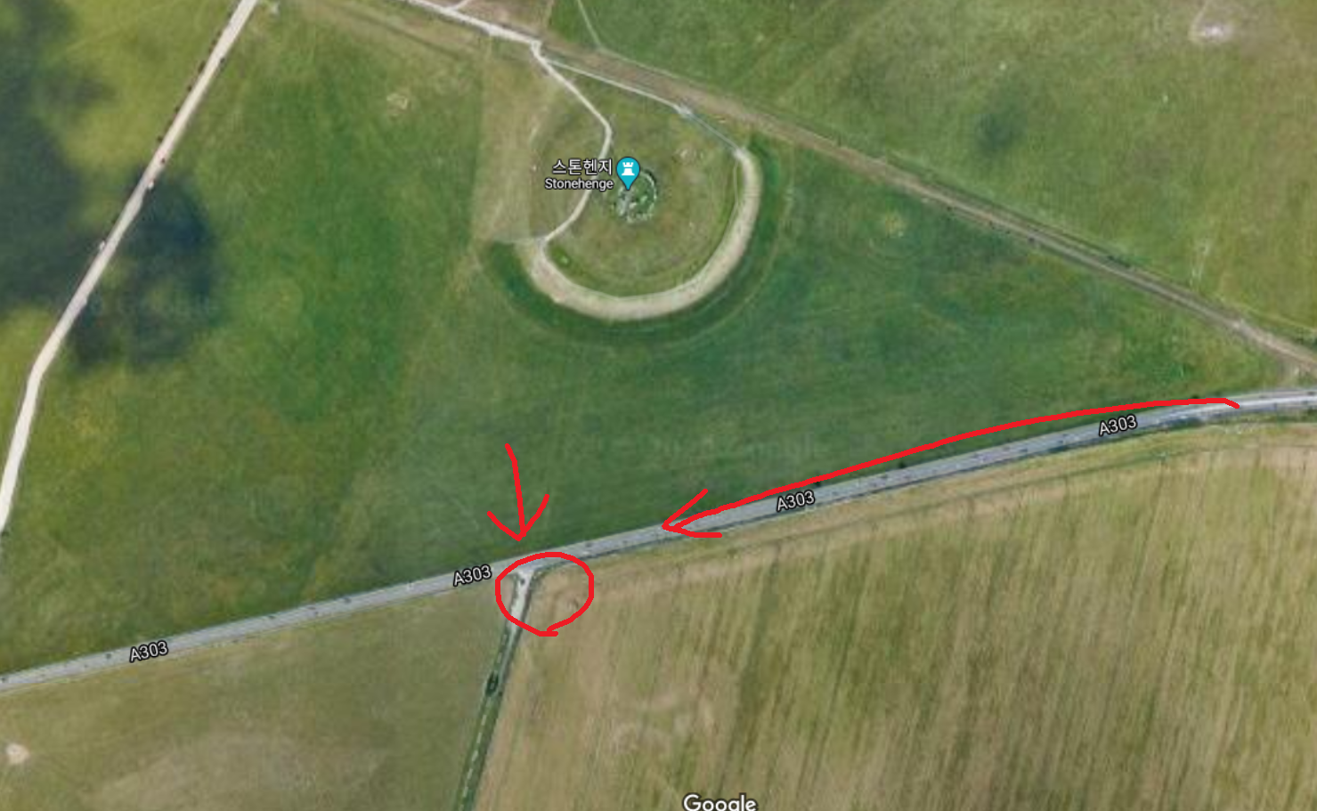 A. 한 가지 방법은 위에서 소개한 마을에서 하루 자고 담날 새벽 동트기 직전에 차를 타고 스톤헨지가 가장 잘 보이는 위치로 가는 것이다. 그땐 교통량이 없으니 괜찮다. 아래에 사진으로 안내하겠다.