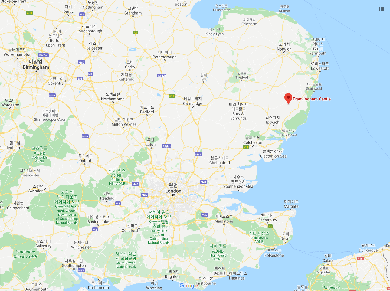 브리튼 섬 남해안 일주(?)를 마치고 이제 이스트앵글리아 지역으로 이동한다. 앞의 글(https://joyance.tistory.com/366)에서 소개한 그 다리를 건너서 얼마동안 고속도로를 달리다가, 아름다운 시골길로 접어들어 한참을 달려서 프램링햄이라는 마을에 도착했다.