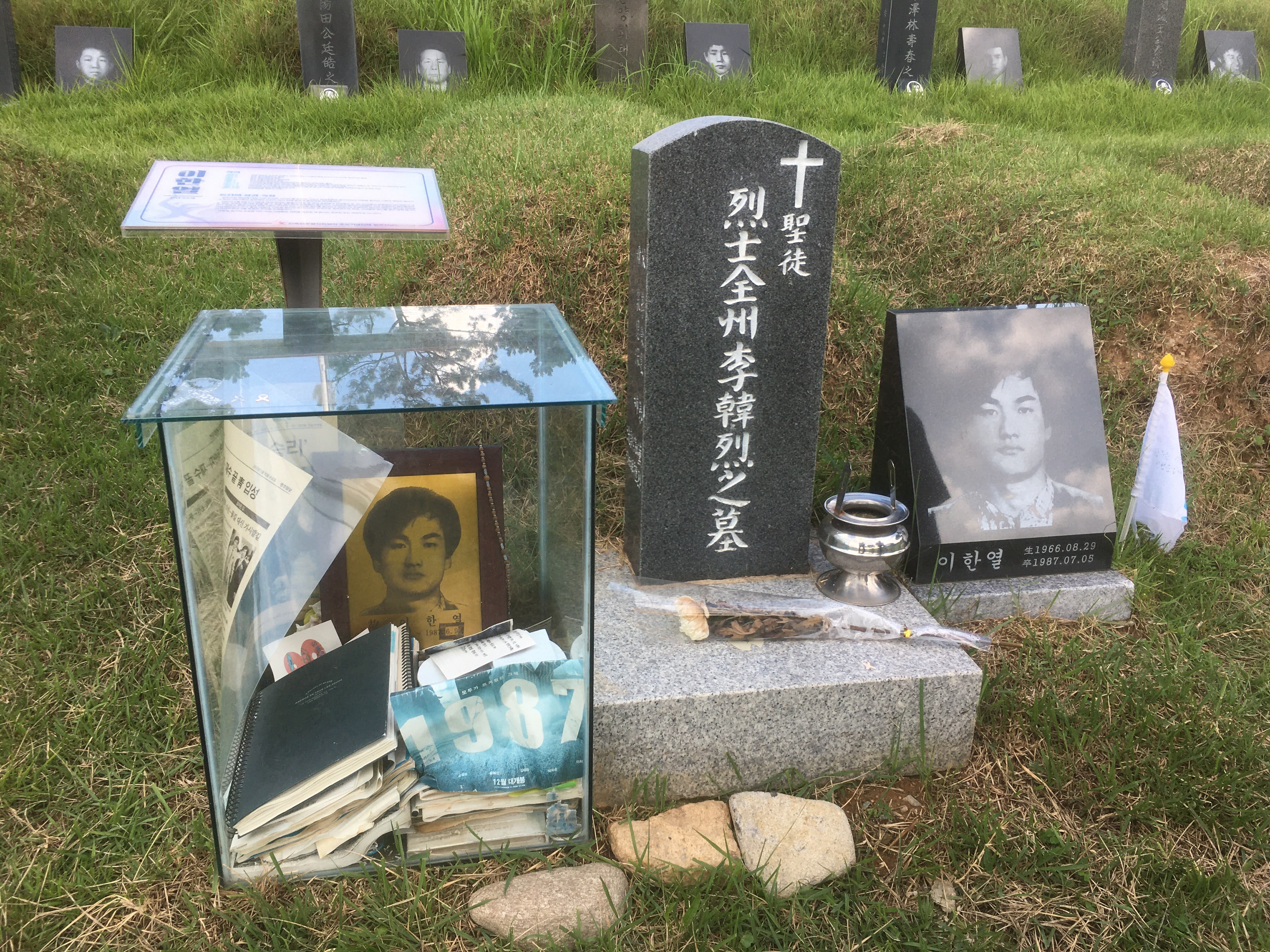 영화 1987의 성공으로 더 많이 알려진 이한열 열사의 묘소. 관련 자료가 놓여있다.