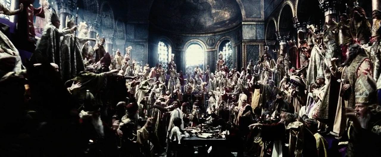 수많은 교파의 종교지도자들이 시장 바닥같은 성당에 모여서 고래고래 소리를 지르며 각자가 생각하는 교리를 주장하고, 그 사람들이 모여서 지극히 정치적인 이유로 주요 교리들을 (무려) "투표"로 결정하는 장면이 흘러간다. 복음서 종류와 부활절 날짜와 각종 의식은 물론, 예수의 신성도 여기서 투표로 확립한 결정인 것처럼 표현한다. 극적 효과를 높이기 위해 여기서 주인공 커플은 도무지 믿기지 않는다며 황당한 표정을 짓지만, 완전 똑똑해 보이는 티빙 교수는 마치 엄청난 비밀을 폭로하는 것처럼 어두운 방안에서 신격화 된 예수 이야기를 이어간다. 물론 우끼고 자빠진 내용들이지만 신뢰감 쪄는 간달프 아저씨가 진지하게 연기하는 그 장면의 설득력은 엄청나다.