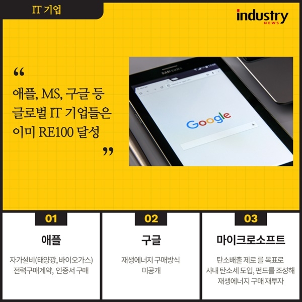 빅테크 기업들을 예로 들어보자. 애플은 새로 지은 사옥의 전기를 100% 친환경 전기로 운영하고 있다. 그리고 아이폰 등을 생산하는 공장에서도 100% 청정에너지만 쓰겠다고 공언했고, 목표치에 상당히 근접했다고 알려져 있다. 이는 직접 친환경 전기를 생산하는 것도 있지만 주로 녹색 프리미엄을 지불(재생에너지로 만들어진 전기를 비싼 값으로 구매)하거나 인증서 구매(재생에너지로 만든 전기임을 인증하는 인증서를 구매)하는 방식으로 충당한다. 이런 것들을 모두 모아서 활용하면서 애플은 RE100 기준을 선도적으로 맞춰가고 있다. 이러한 방법들은 애플의 수익을 깎아먹지만, 청정에너지 산업 전반을 키우는 데 큰 도움을 준다.