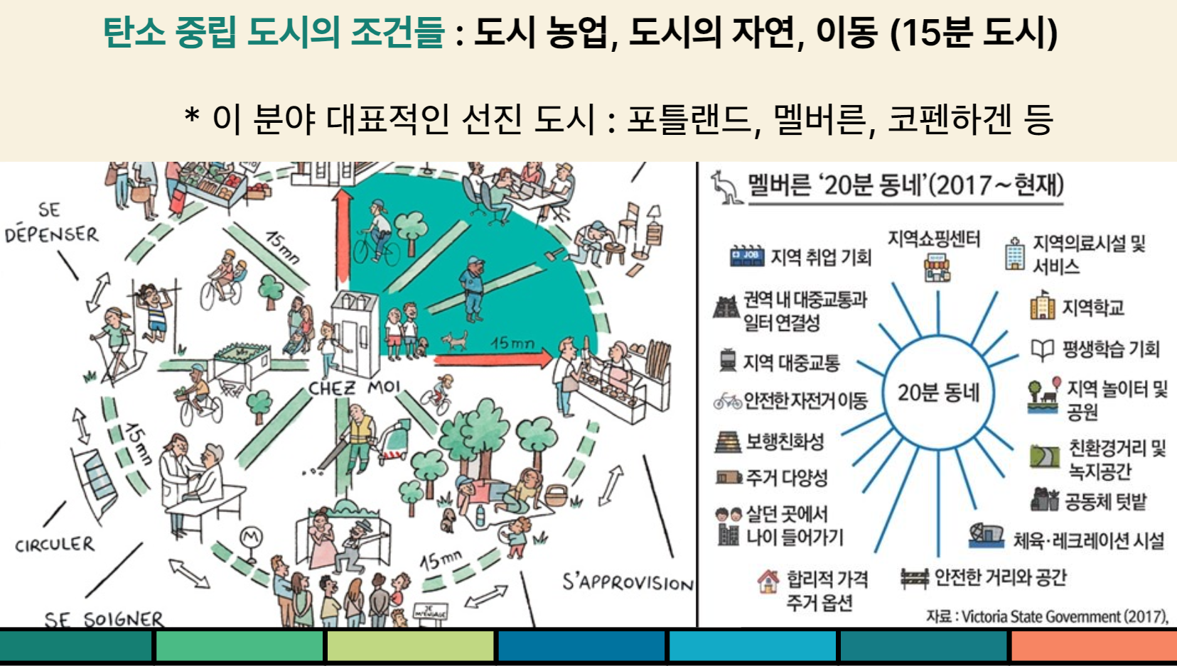이렇게 해서 나온 개념이 "15분 도시"이다. 인간이 살면서 필요한 것들이 대부분 도보로 15~20분 이내에서 해결될 수 있도록 도시 설계 및 구성을 전환(Shift)하자는 것이다. 아래 그림을 참고하자. 벌써 많은 선진적인 도시들이 이러한 15분 도시를 표방하고 전환에 나서고 있다.