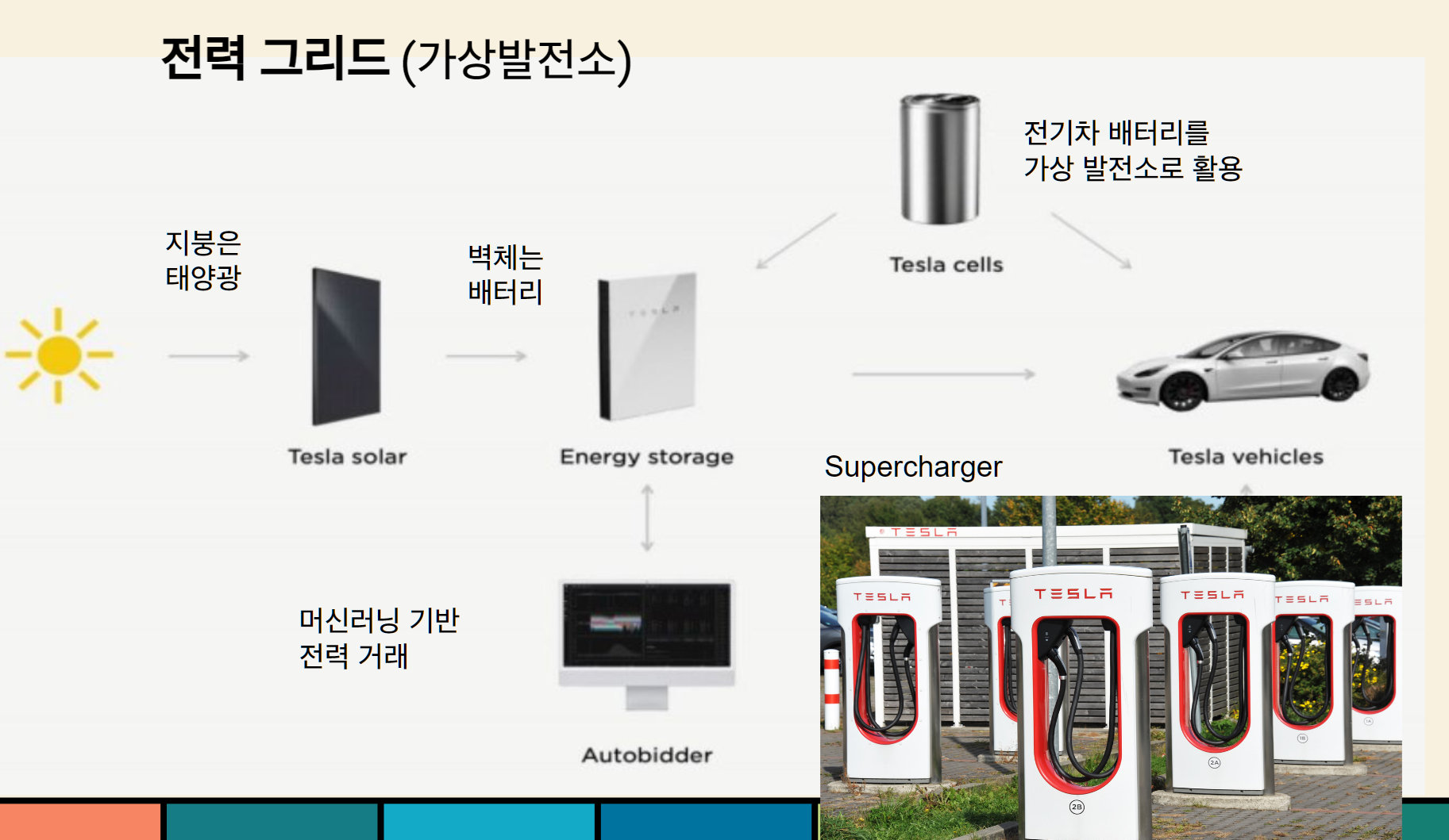 테슬라는 솔라 루프, V2G, Auto Bidder 등의 기술을 통해 가상 발전소를 구축하고 있다.