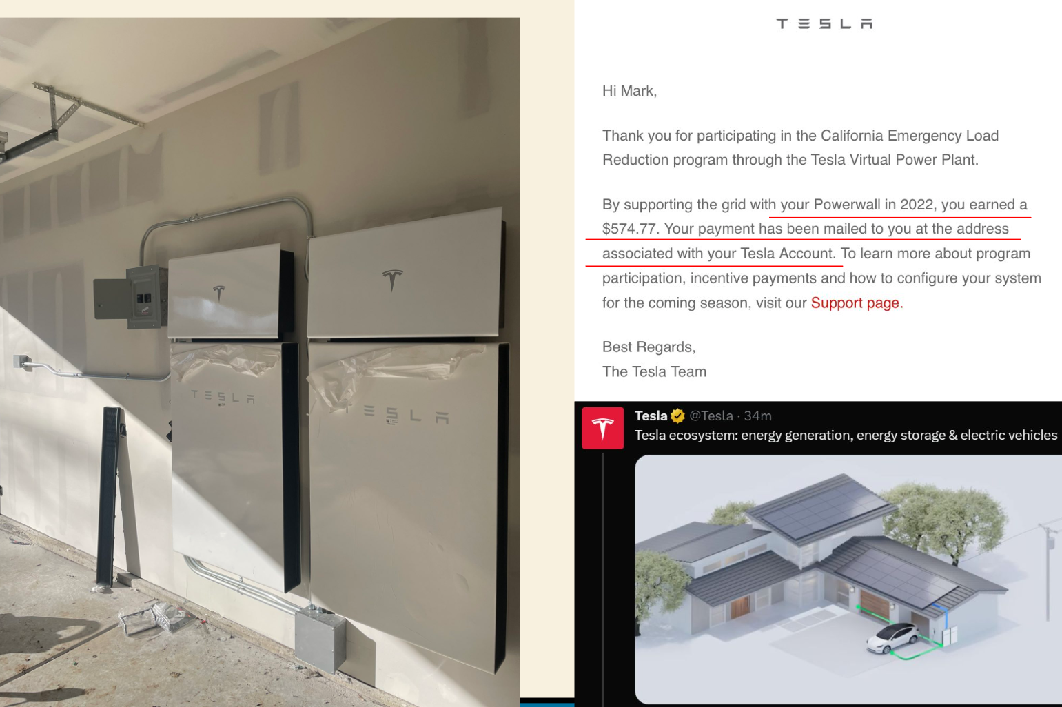 캘리포니아의 기후대응 프로젝트에 참여해주셔서 감사하다, 테슬라 버추얼 파워플랜트를 통해서... 어쩌고 저쩌고 하면서... 네가 이 전력망 지원해준 덕분에 작년에 번 돈이 574.77달러다, 테슬라 계정에 있는 네 어카운트에 입금해 줄께잉~
