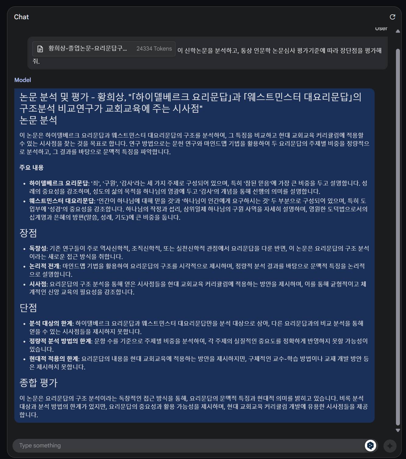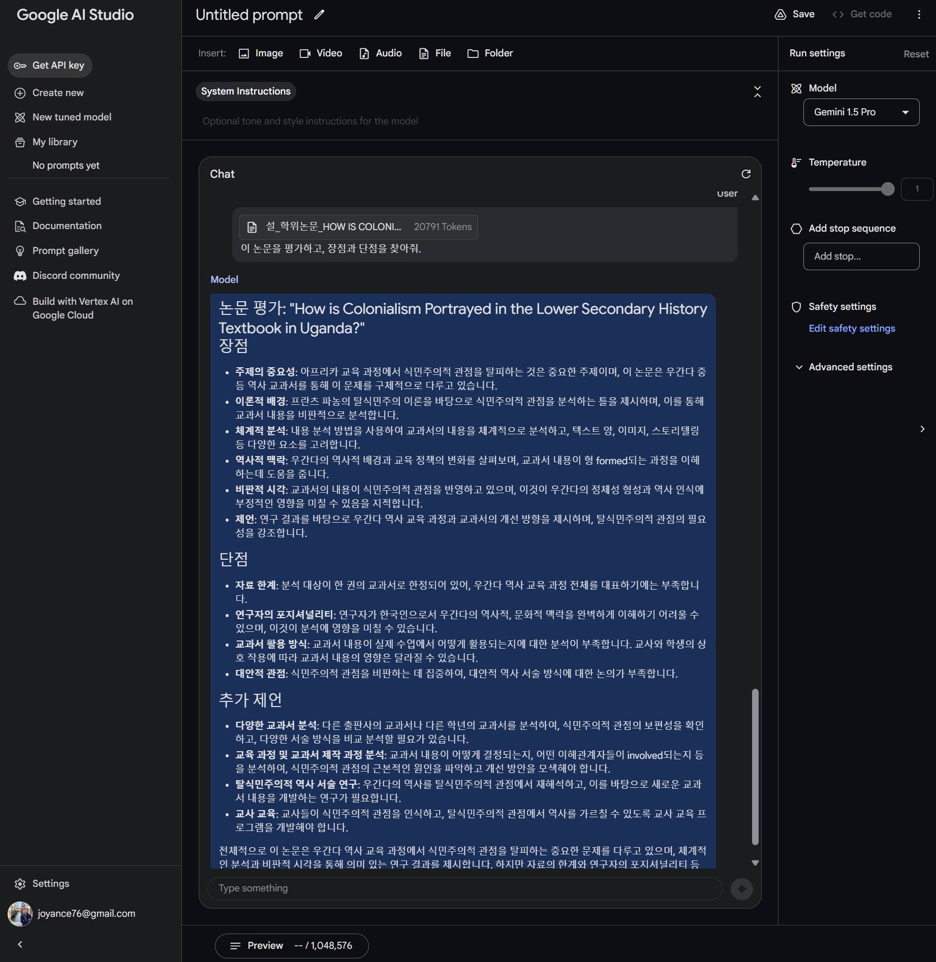 한번에 먹는 데이터가 워낙 크니까, 논문파일 통째로 주고 평가 시킨다든지, 문서와 관련된 자료조사를 그냥 알아서 하도록 시켜먹는다든지 등을 할 수가 있다. 우리 부부의 논문을 각각 넣어봤는데... 오싹했다. ㅎㅎ