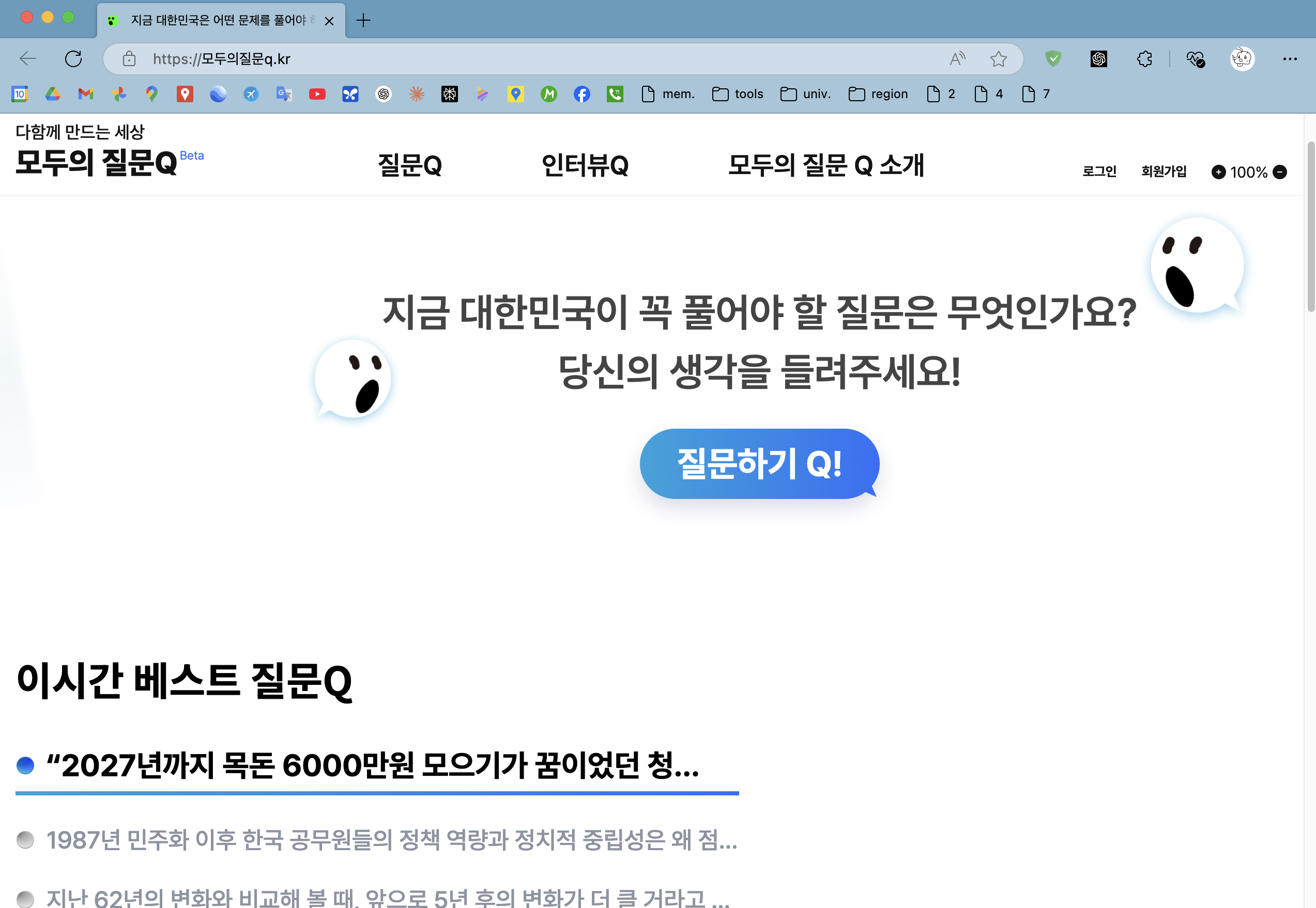 말이 길어졌다. 인간 활동의 궁극적인 목적을 단순히 이익이나 권력으로 축소하는 건 현대적 가치와는 어울리지 않는다. 이제 우리는 인간 본질과 사회적 활동의 목적을 다시 바라보고, 이를 통해 개인과 공동체 모두가 더 나은 방향으로 나아갈 길을 찾아야 할 때다. 그런 점에서, 이번에 다시금(!) 시도되는 민주당의 "모두의 질문Q" 프로젝트를, 열렬히 환영하는 바이다.
