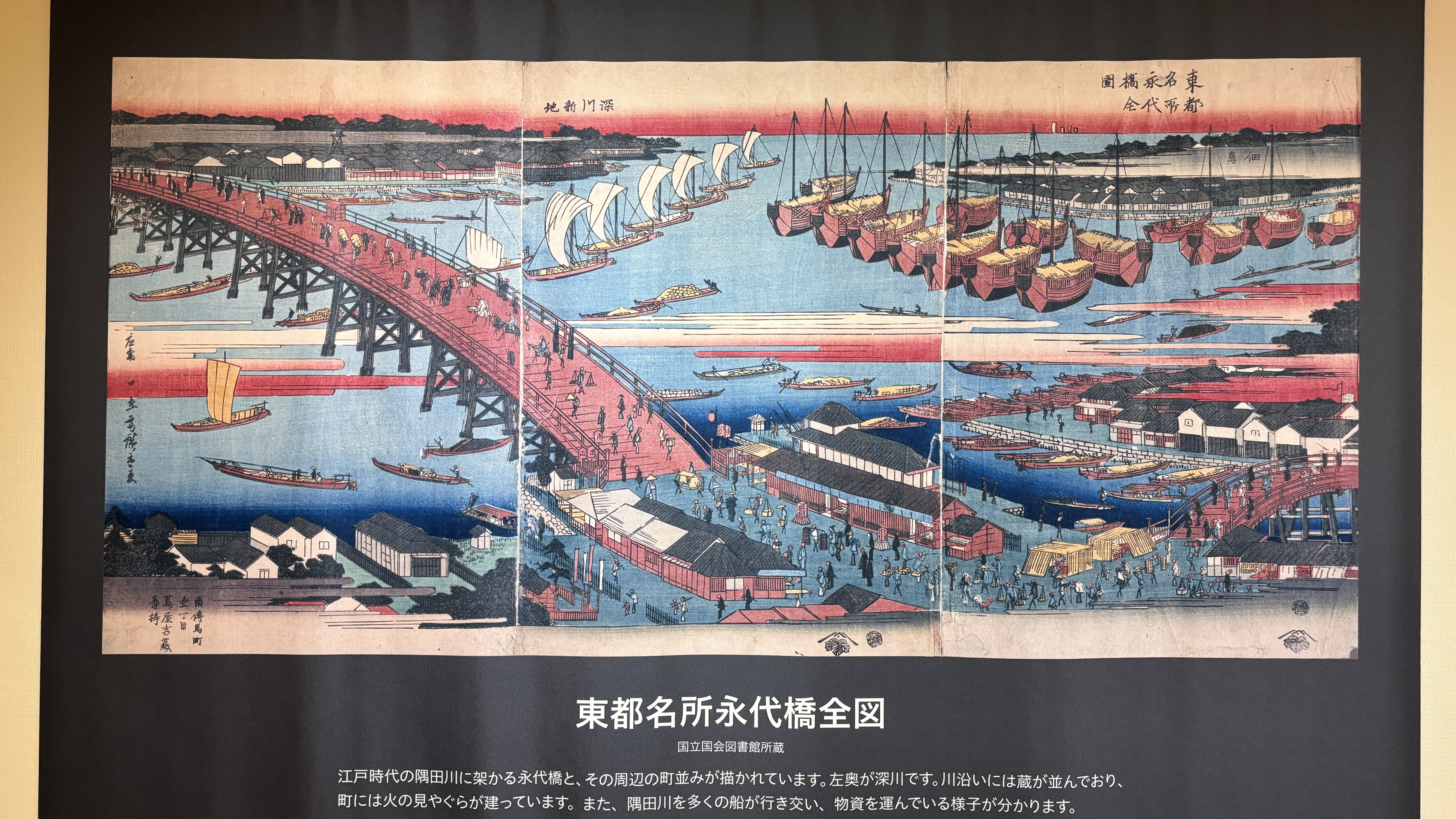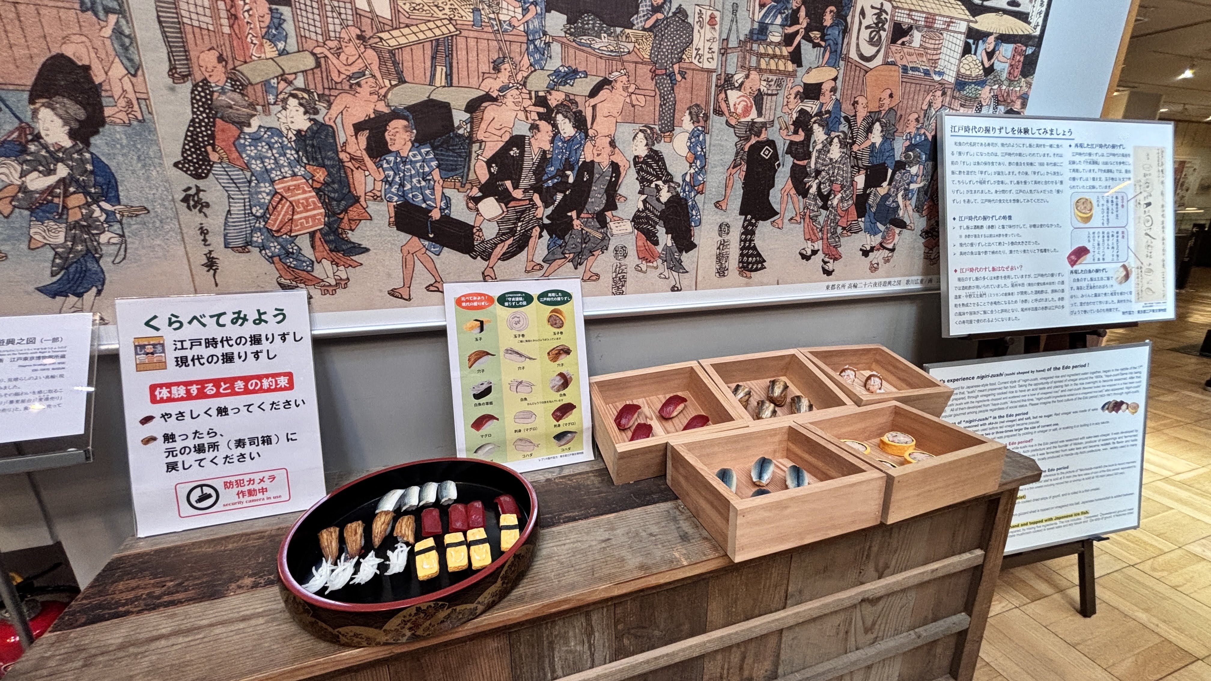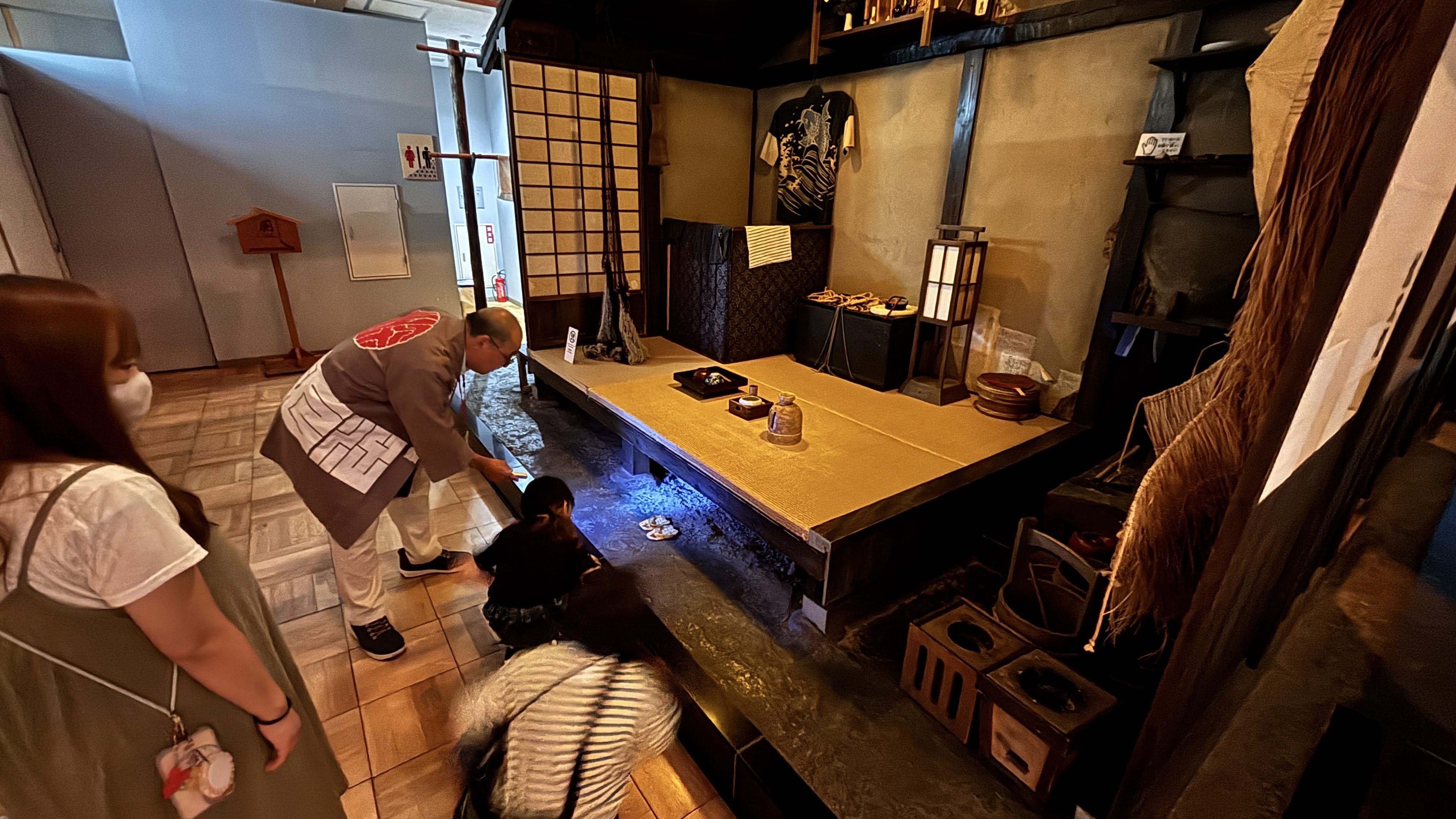 이 박물관이 나름 고증을 거쳐서 전시물을 기획/제작한 것이라 신뢰가 갔다.일본의 명절들 및 그에 맞는 풍속들을 만화로 알기 쉽게 전달: 11, 33, 55, 77, 99, 1111일이 주요 명절이다.감탄이 나오는 그림이다. 과거의 모습을 상상할 수 있도록 한 그림. 석양이 강물에 반사되는 것을 독특하게 표현했다. 나중에 알고보니 이 화가의 작품 스타일이 유럽 인상주의에 영향을 주었다고 한다. #자포니즘이렇게 박물관 직원(학예사? 자봉단?)이 서포트 해주는 것이 정말 좋았다. 이 사진은 생쥐를 함께 찾아보자며 플래시를 비치는 중인데, 다음 순간 생쥐는 천장 밑 시렁 위에서 등장한다. ㅎㅎㅎ 아이들이 뜻밖의 발견에 너무너무 좋아했다.사진만 보면 그저 그런데, 이 마을에서 들릴법한 소리들이 사운드 효과로 주어져서 정말 실감이 난다.