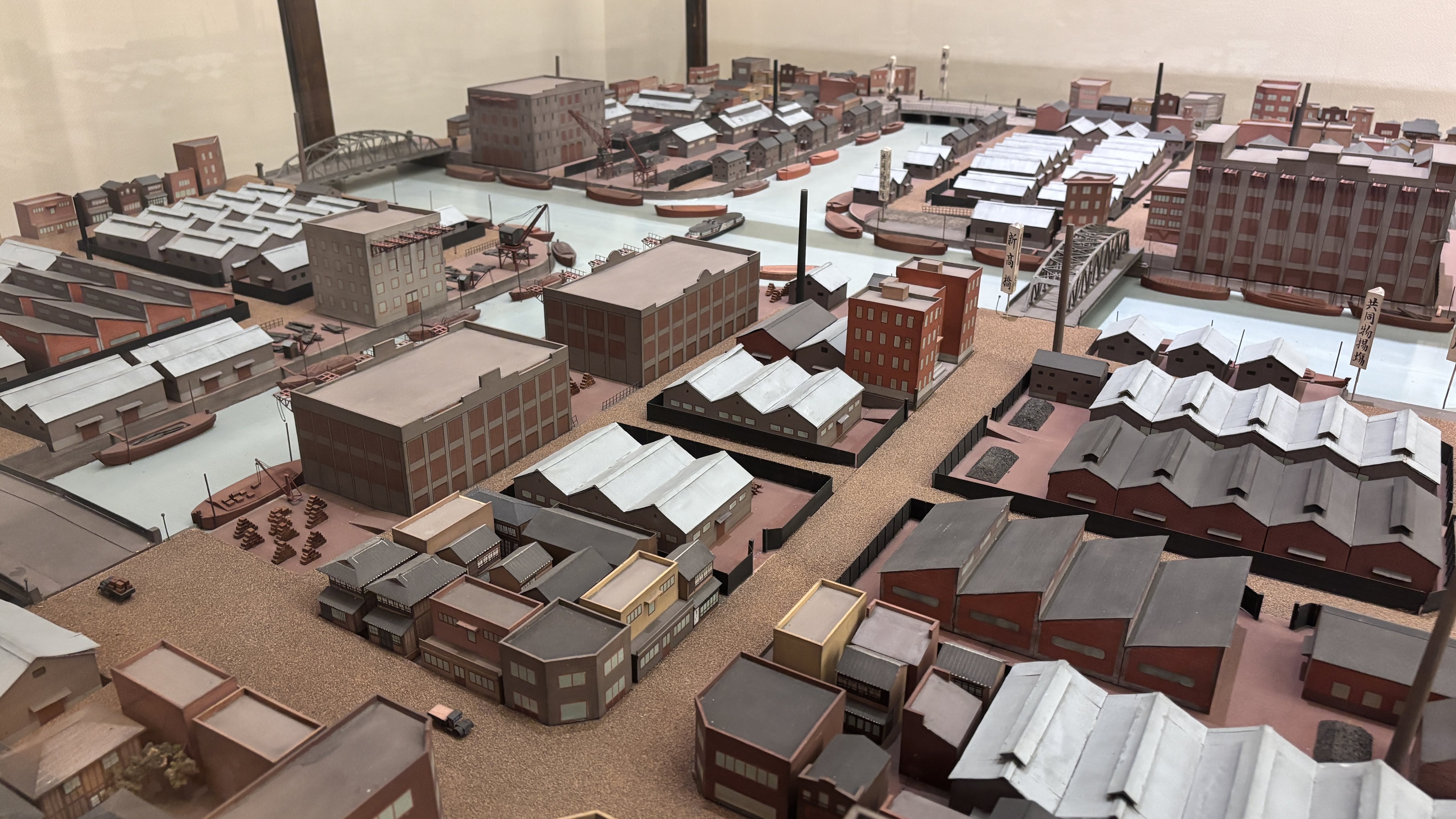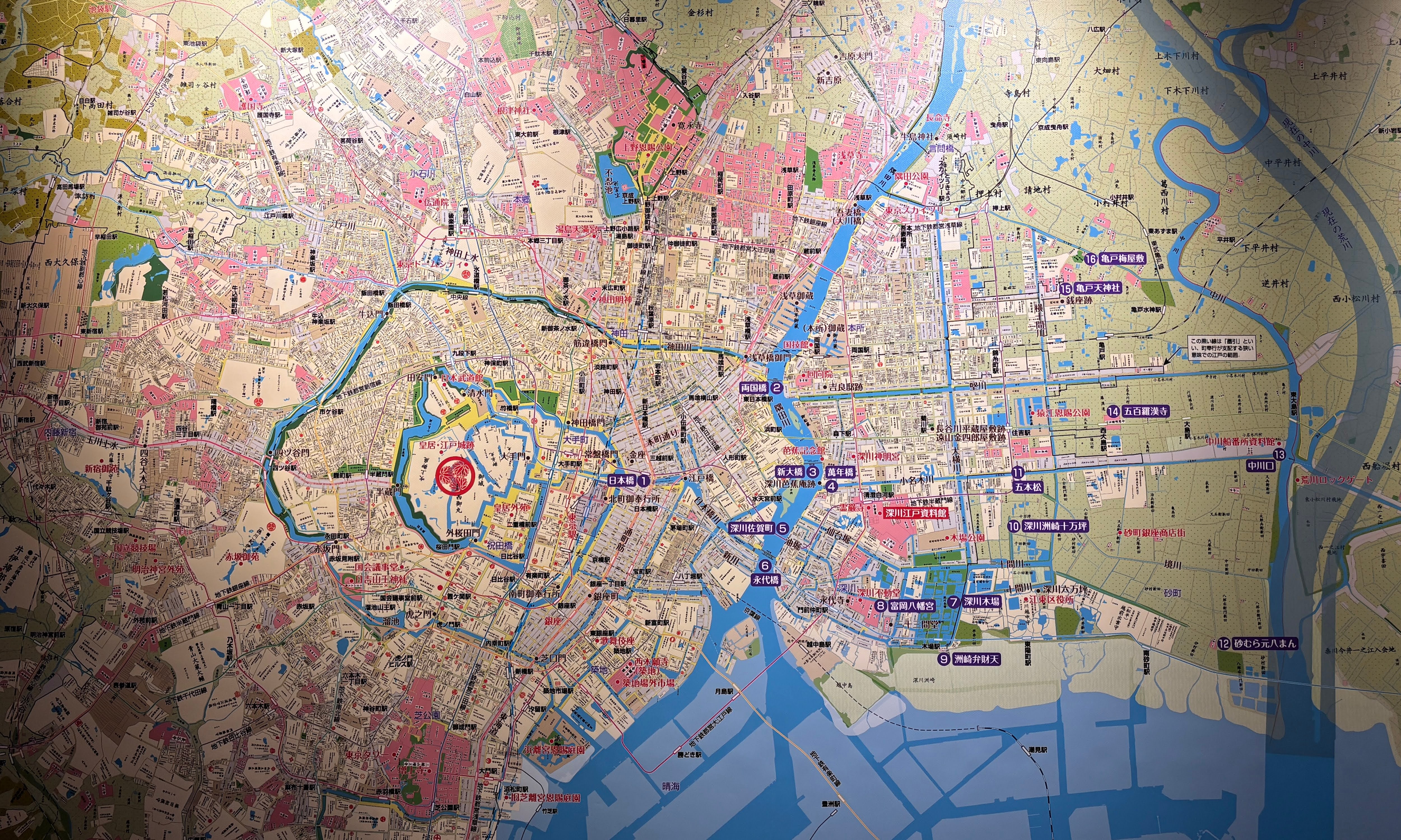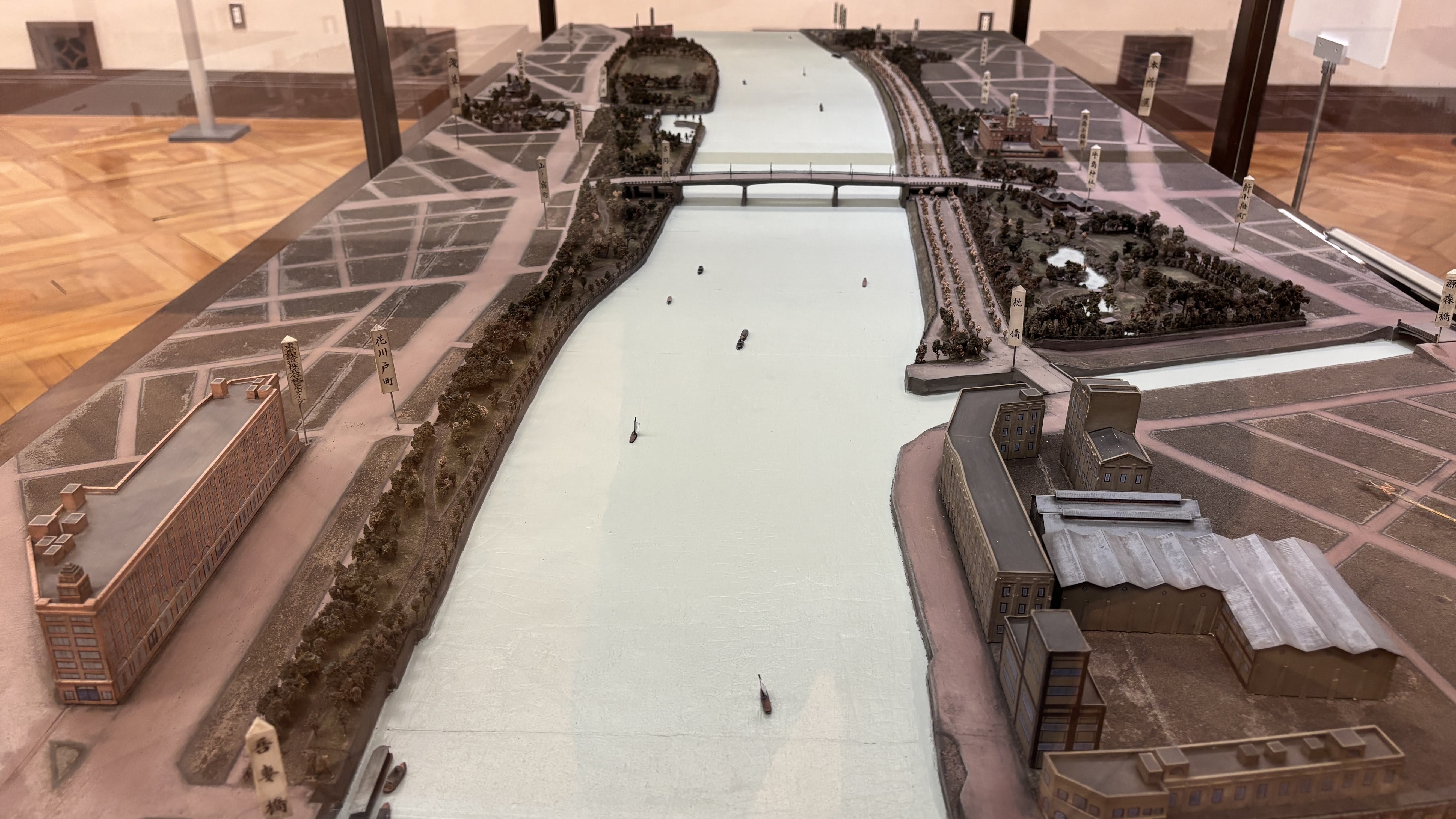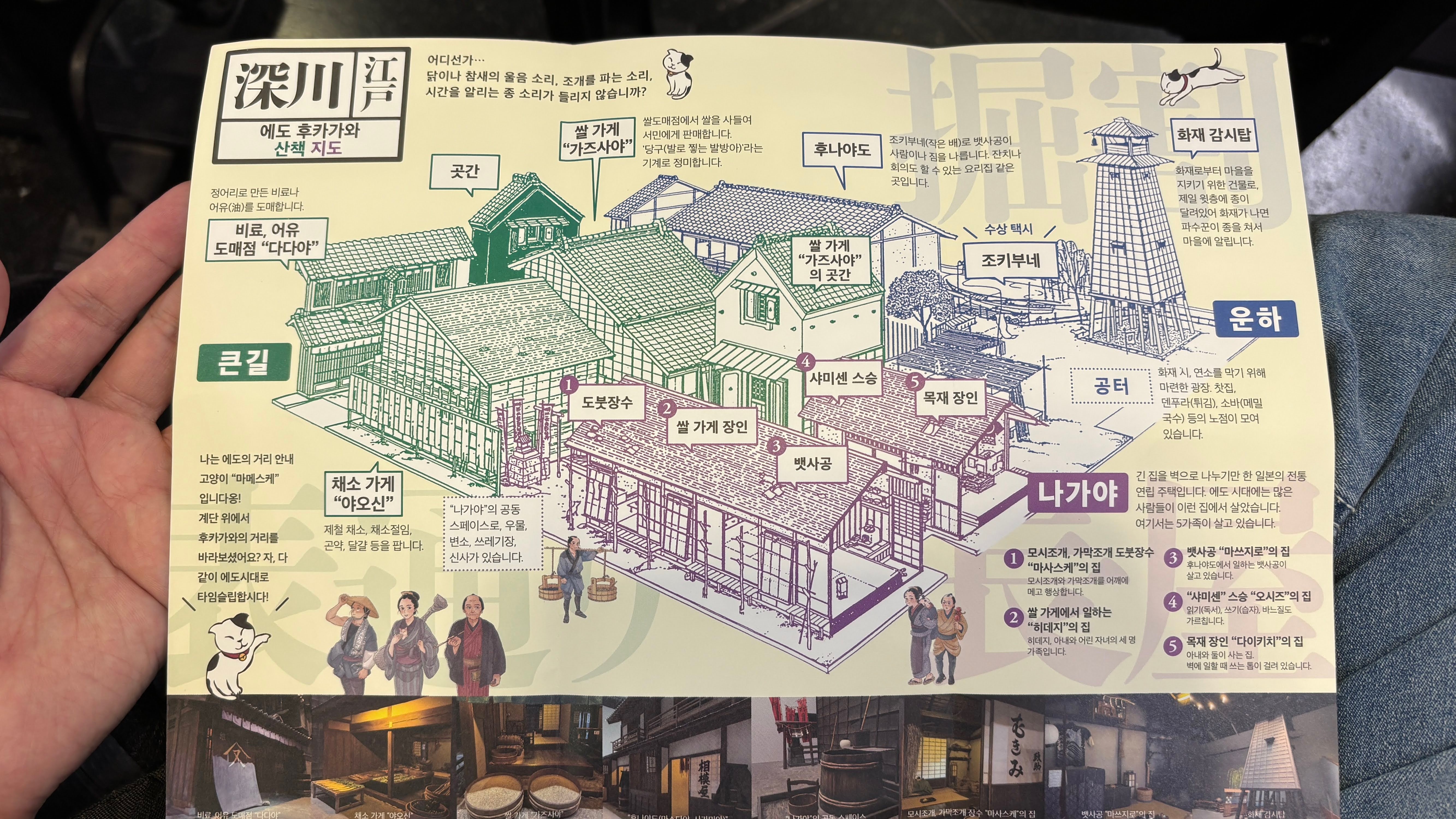 입구에 이런 아저씨들이 ㅋㅋ아참, 신용카드가 되는 자판기가 이렇게 가뭄에 콩나듯 있긴 하다. 혹은 전용 앱을 깔고 이용하는 자판기 부류가 있는데 그걸 이용하면 현금이나 IC카드를 별도로 만들거나 하지 않고도 도쿄에서 자판기 이용이 가능하다.박물관 팜플렛. 내가 한국인인 것을 알아보고 한국어 안내장을 쥐어준다.1층으로 진입했는데 지하 공간까지를 터서 큰 공간을 만들고 에도 시대의 이 지역을 재현해 놓았다.가운데 흐르는 스미다강을 기준으로 오른쪽이 강동, 즉 고토 시티 지역이다. 아주 과거에는 대부분 늪지, 습지, 갯벌이였다고 한다.