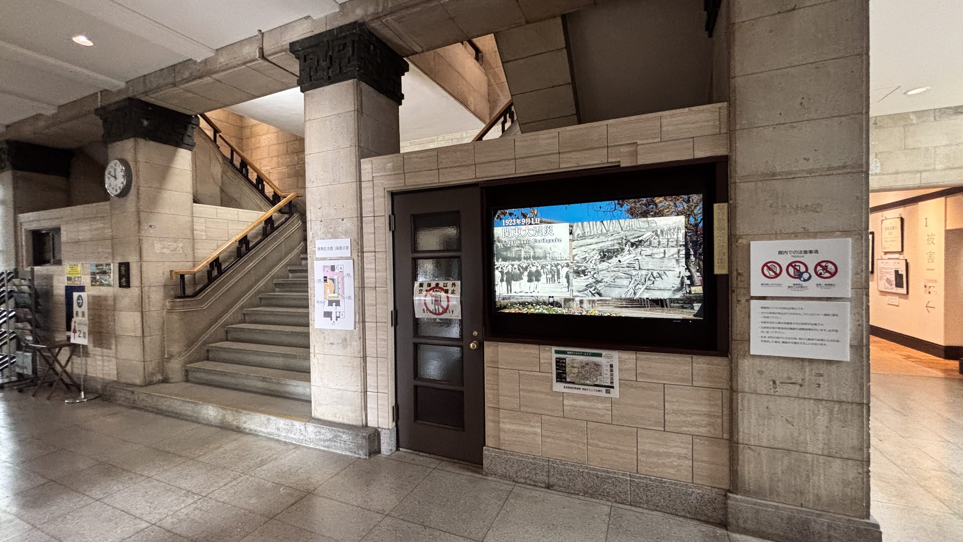 일부 사람들은 지금 도쿄 대지진이 임박했다고 예상하고 있다.입구에 들어서면 1층부터 보라고 안내가 나온다. 시대순으로 보려면 그게 맞다. 1층이 대지진, 2층이 전쟁이다. 도쿄가 크게 파괴된 두 사건이다.지진계 기록간도 대지진은 말로만 많이 들었지 사진으로는 처음 자세히 보게 됐는데 어마어마했겠다는 생각이 든다.