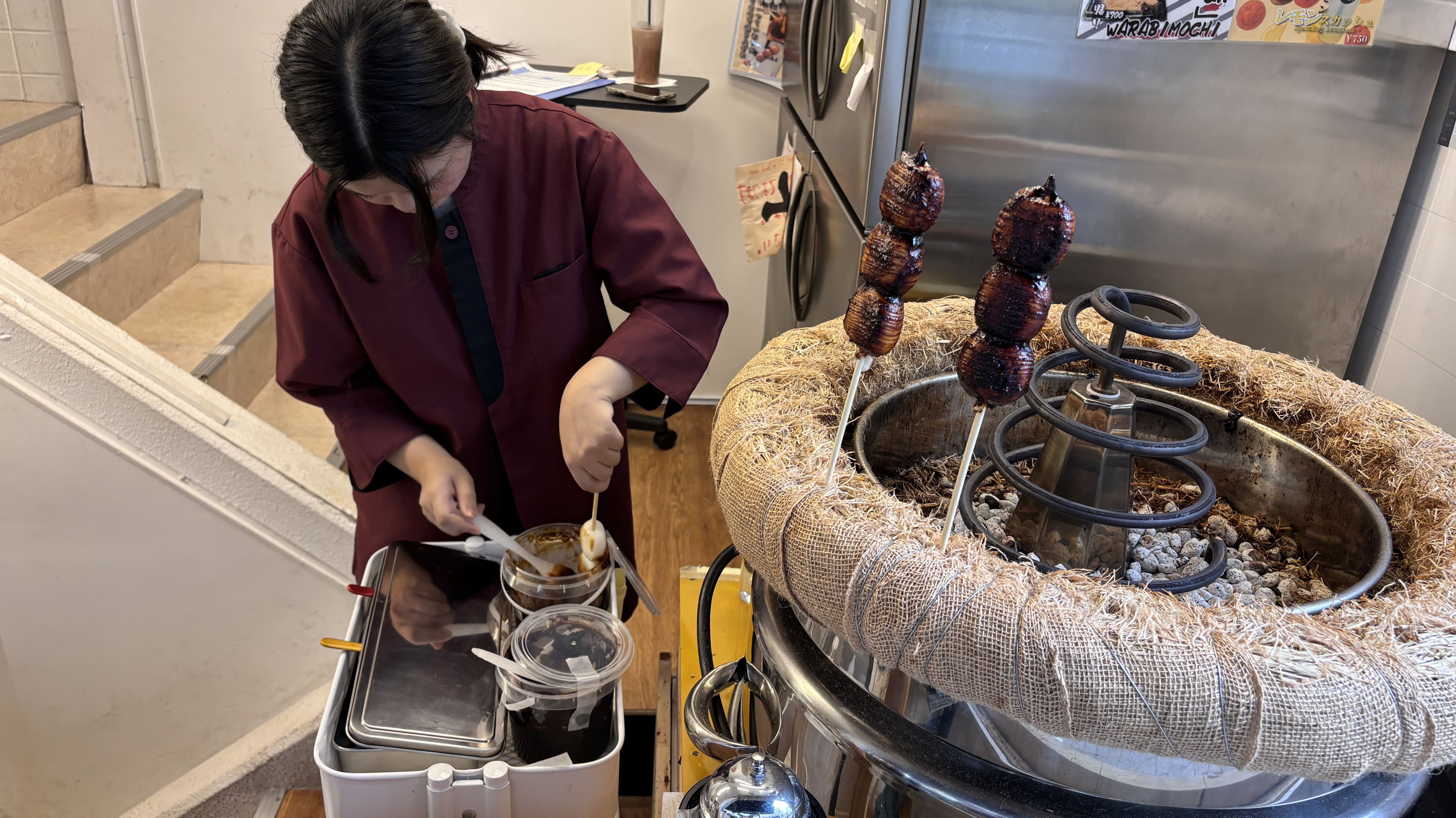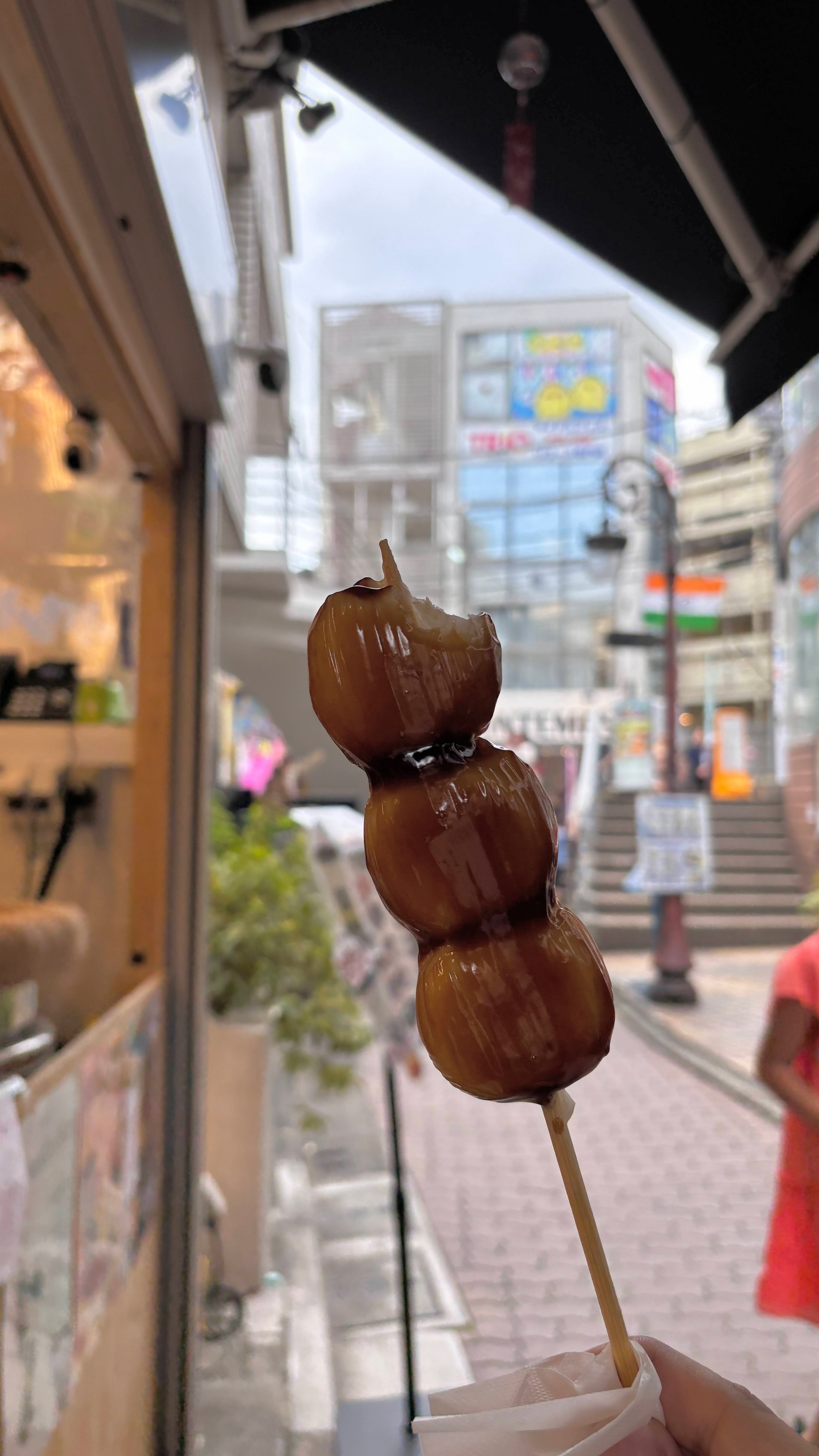 골목 안쪽에는 지쳐 쓰러진 사람들도 보인다. ㅎㅎㅎ 공감이 됐다.골목길에서 일본 전통 간식을 하나 사서 칼로리를 더 보충했다. 평범한 떡꼬지에 특별한 소스를 코팅해서 주는데, 어렸을 때 먹던 조청 맛과 비슷했다.