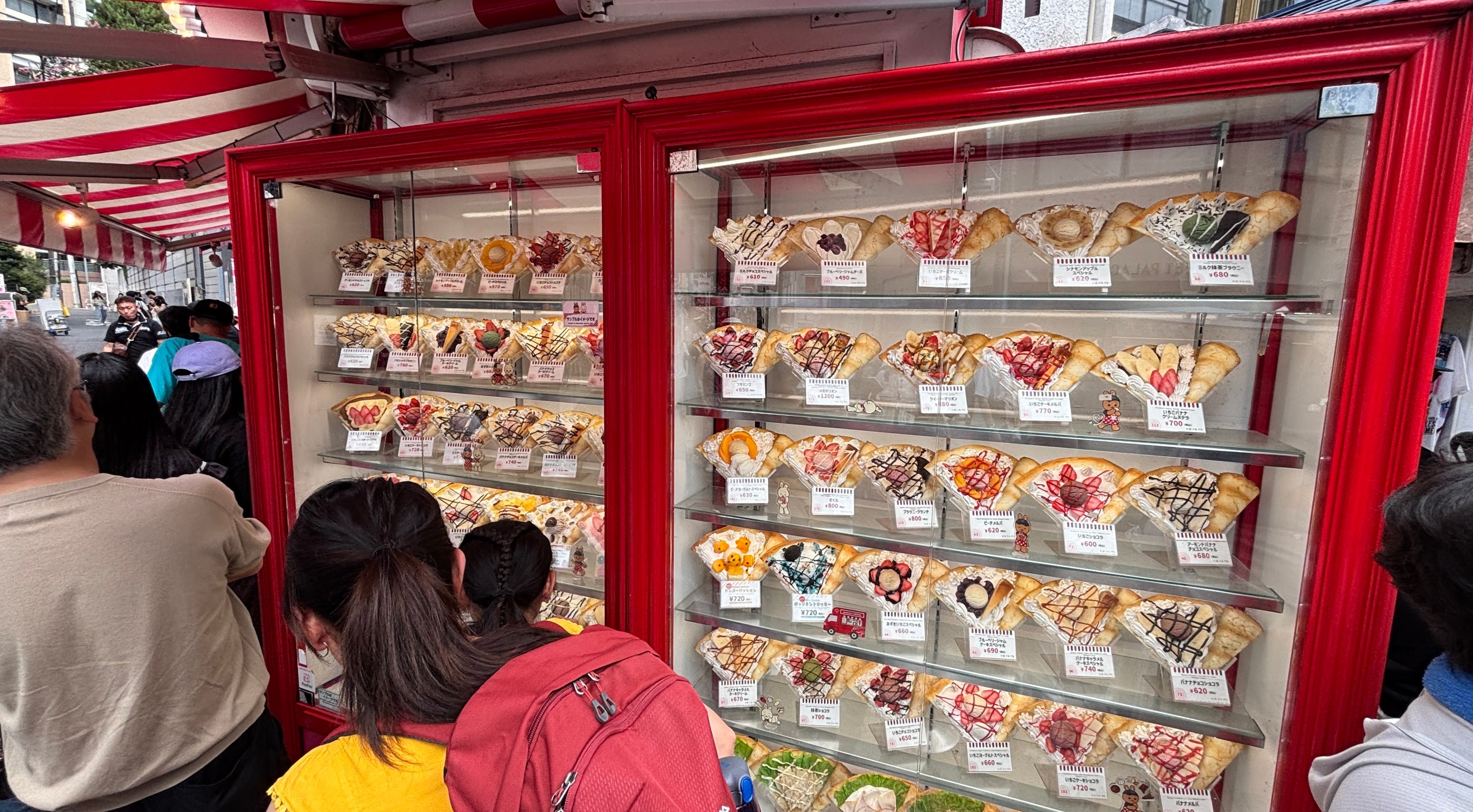 사람이 엄청나게 많은 Takeshita 거리(Meiji 거리)로 들어섰다. 온 세상 인종이 다 모여서 골목길을 걷고 있었다. 특별히 세계 각국에서 온 단체 관광객이 많았다. 투어 가이드들이 들고있는 깃발이 여기저기 보인다.어디서 많이 본... 그런데 이름이 낯설다. 젯데리아?? 아아.. 이게 바로 말로만 듣던 일본의 롯데리아로구나...구글맵을 보니 몇 년 전까지만 해도 이름이 롯데리아였다. 뭔가 계약사항이 바뀐 듯."코리아 넘버원 버거"라고 홍보하는 맘스터치도 보였다. 아마 매장 갯수 기준으로 말하는 듯했다.좀 걷다보니 사람들이 줄서서 뭔가를 사먹고 있었는데, 아까부터 골목길에 이걸 손에 쥔 사람들이 많았다. 알고보니 꽤 유명한 '마리온 크레페' 가게.80여종의 크레페를 골라서 주문할 수 있었다. 가격은 5천원 선에서부터 올라가서, 비싸도 만원 미만이다.