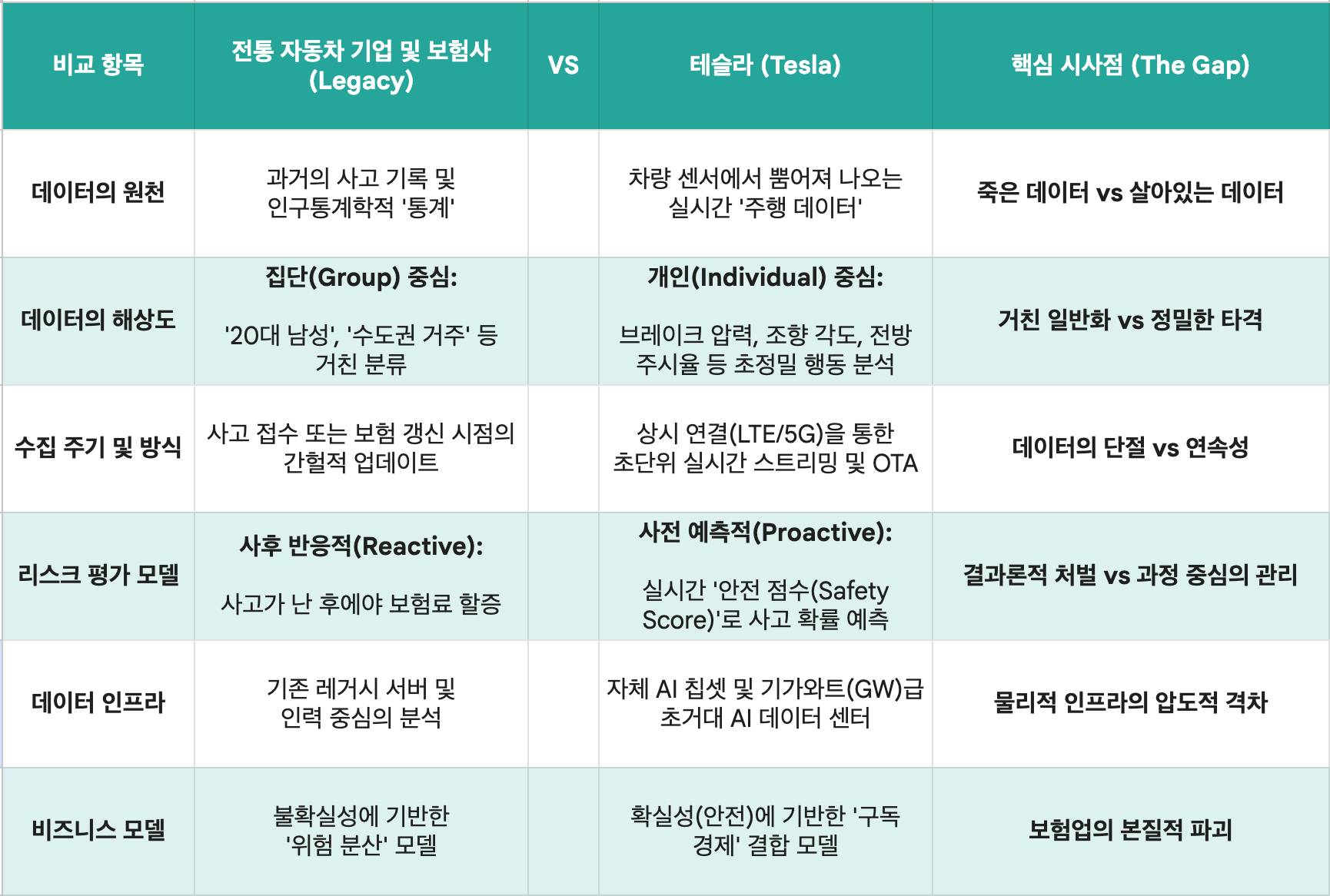 몇 년 전에 워렌 버핏은 테슬라의 보험업 진출을 조롱한 적이 있다. 원래 전통적인 보험업계의 거물이었기에, 자동차 회사가 보험사업을 하겠다는 말이 욱기게 들렸을 것이다. 하지만 전통 보험사가 지난 100년간 쌓아온 연령별 사고발생 통계를 기준으로 '20대 남성', '65세 이상' 등의 러프한 분류로 리스크를 짐작할 때, 테슬라는 운전자의 운전습관(교차로 통과 속도, 급브레이크 횟수, 깜빡이 예절 등)을 실시간으로 추적하고 점수화 한다. 운전자마다 실시간으로 달라지는 보험료. 개인별 현실 데이터가 당연히 인구통계학적 자료보다 정확하다.